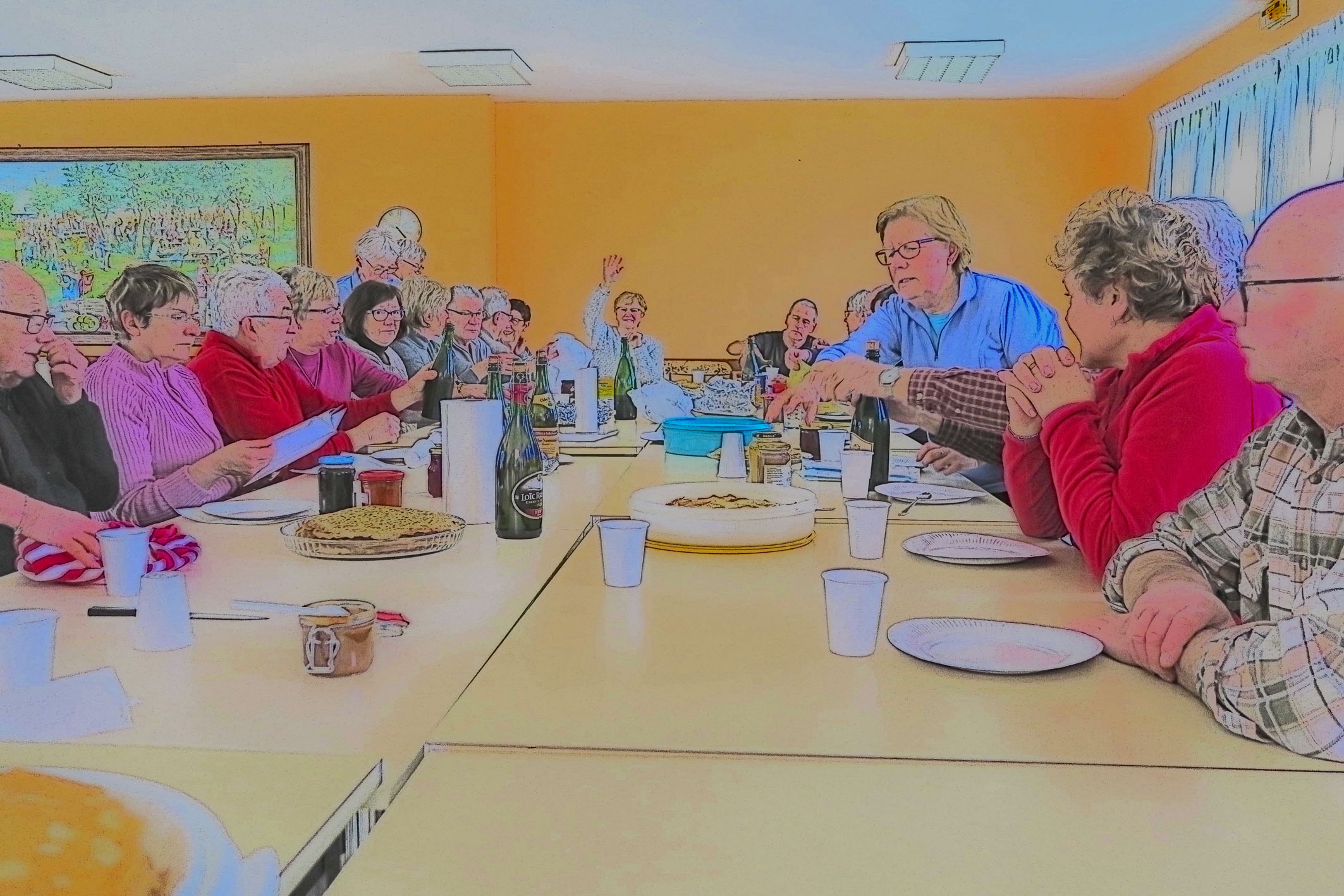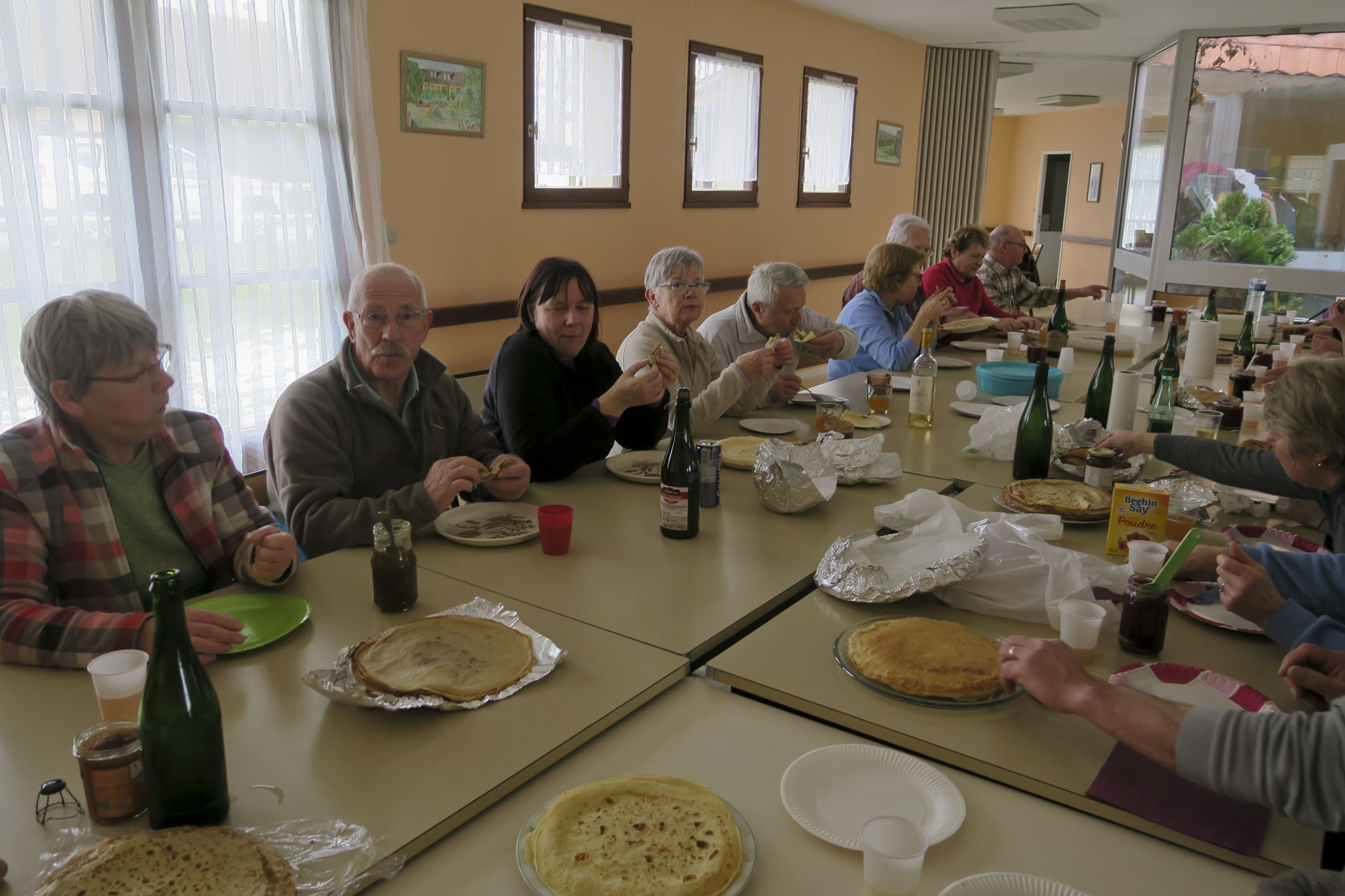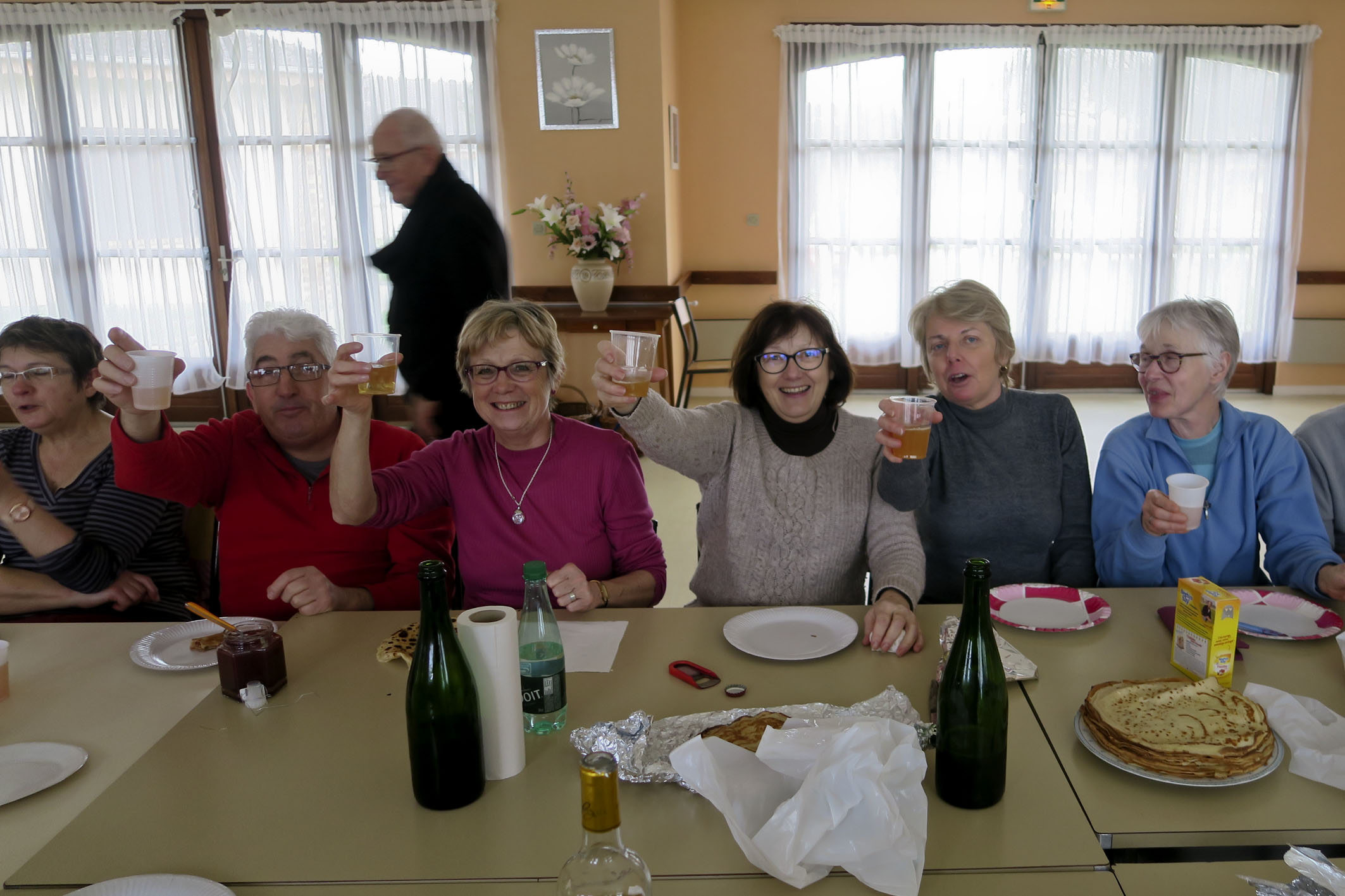 Samedi 10 février à 14 heures, environ 30 randonneurs sont présents pour un circuit de bien-être. Au départ, soleil avec une température de 8 °, vers la moitie du parcours le temps de chien revient vite, la température diminue et une légère pluie fine en fin de parcours. Notre animateur Jacques nous fait déambuler au travers champs, chemins glissants et un peu de route. Bref, nous arrivons à notre but, après un circuit de 8Km maxi. Maintenant rendez-vous au Foyer de la Résidence Saint-Jacques pour une petite collation CRÊPES en gaieté.