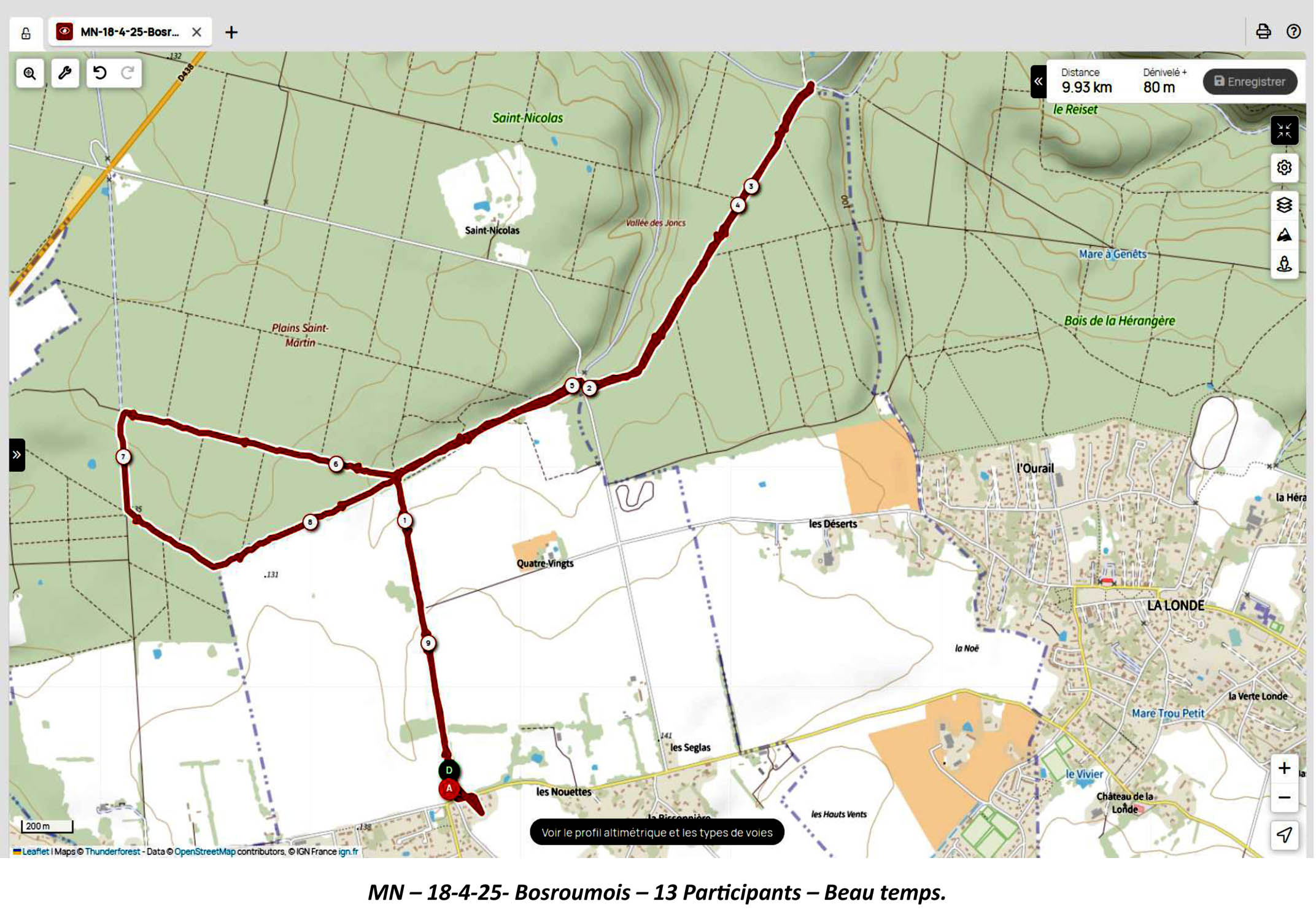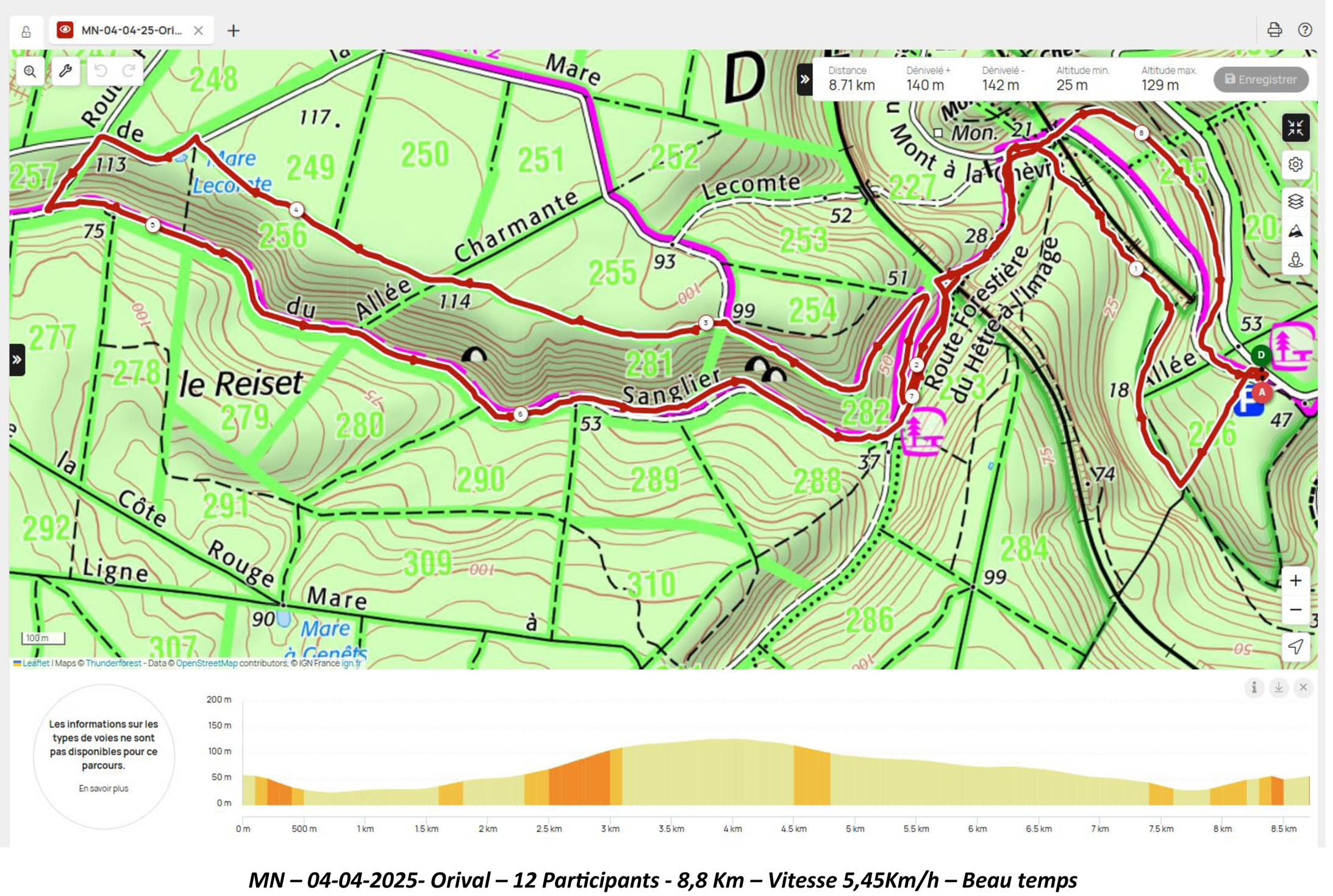 Marche Nordique –Vendredi 4 Avril 25 – pour un départ à 8h50, depuis le parking des 17 tournants – Orival. Nos Animateurs – 12 Participants – Circuit 8,8 Km – Vitesse 5,45 Km/h – Beau temps.