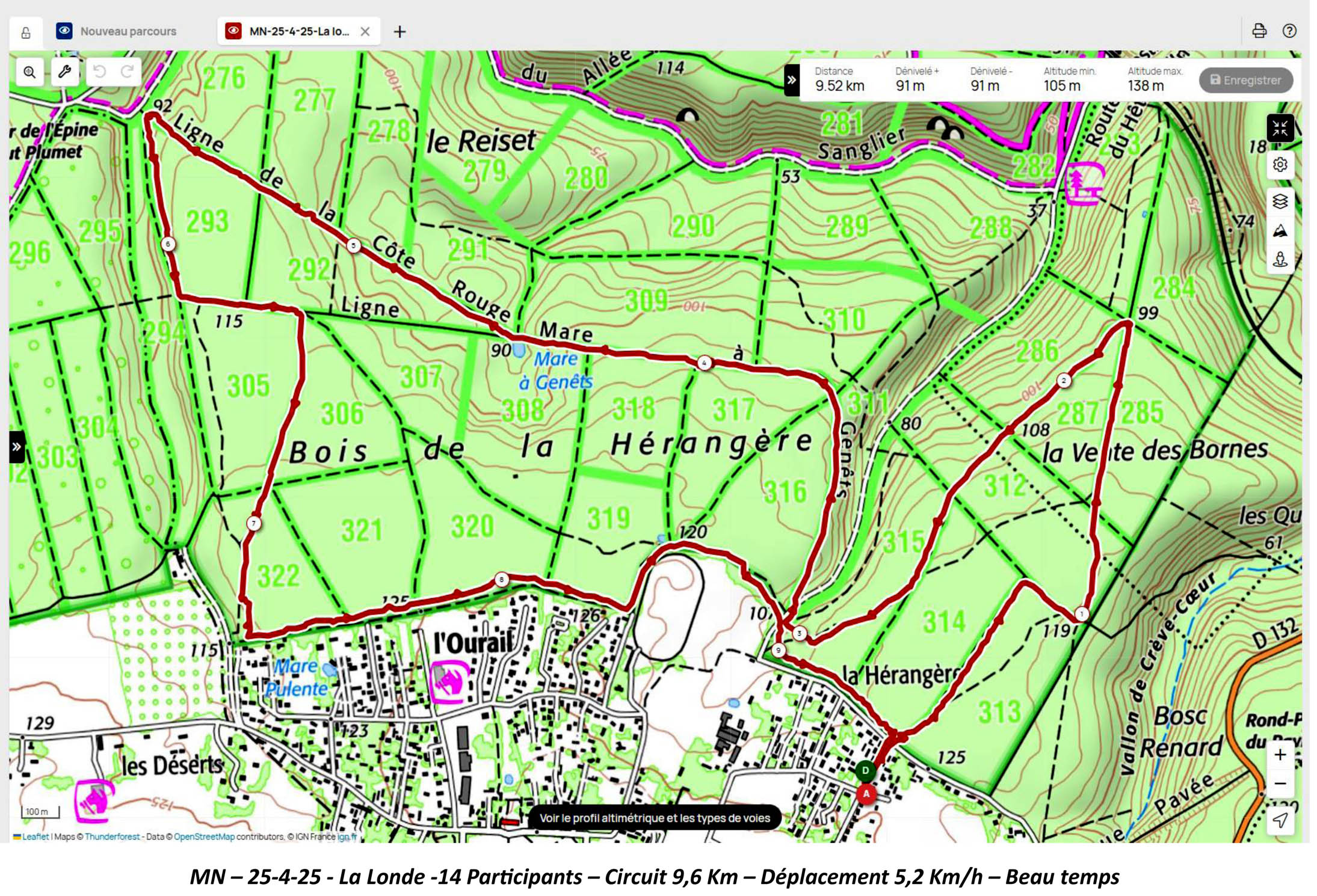 Marche Nordique –Vendredi 25 Avril – pour un départ à 8h50, depuis le parking La Hérangère La Londe. Nos animateurs. 14 Participants – 9,6Km – déplacement 5,2Km/h – Beau Temps.