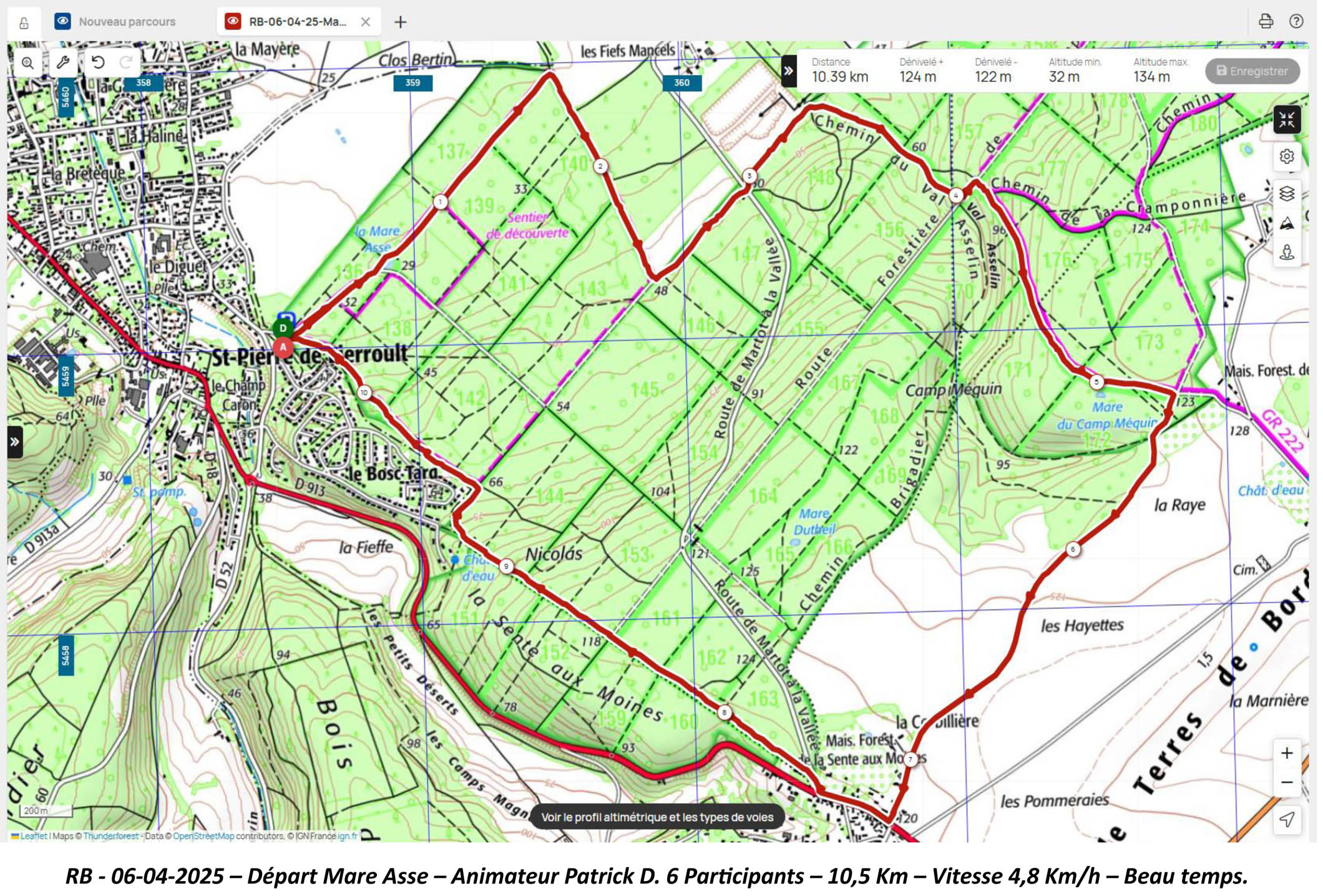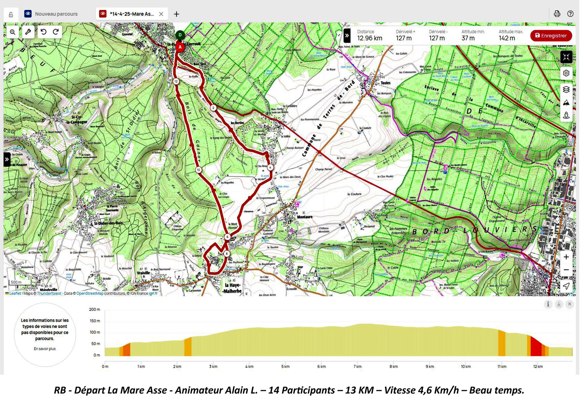 Dimanche 6 Avril – Animateur Patrick D., pour un départ à 9 Heures depuis le parking > La Mare Asse – Rue de Bréant – St Pierre les Elbeuf. Circuit de 10,5 Km Maxi – Dénivelé 120 m – 6 Participants – Vitesse 4,8 Km/h – Beau temps.