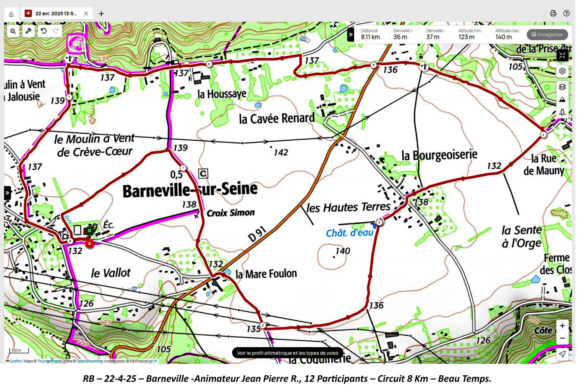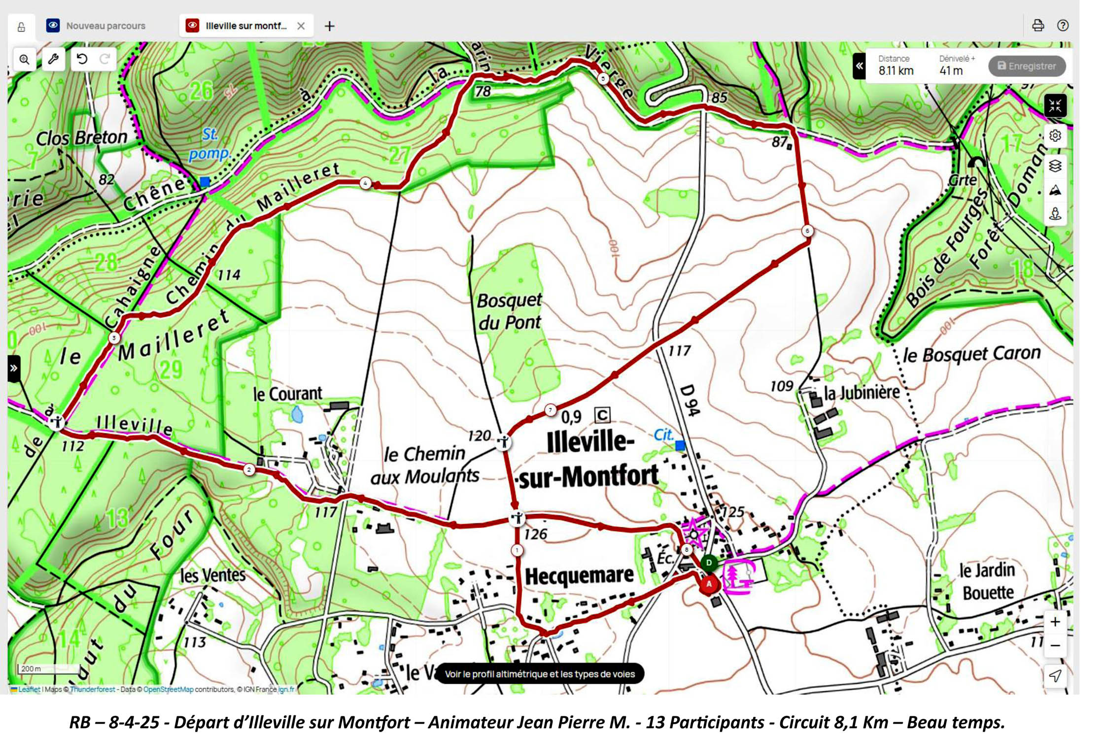 Mardi 8 Avril – Animateur Jean Pierre M., pour un départ à 14 Heures depuis le parking du stade de Illeville-sur-Montfort. 13 Participants – Circuit de 8,1 Km – Beau Temps.