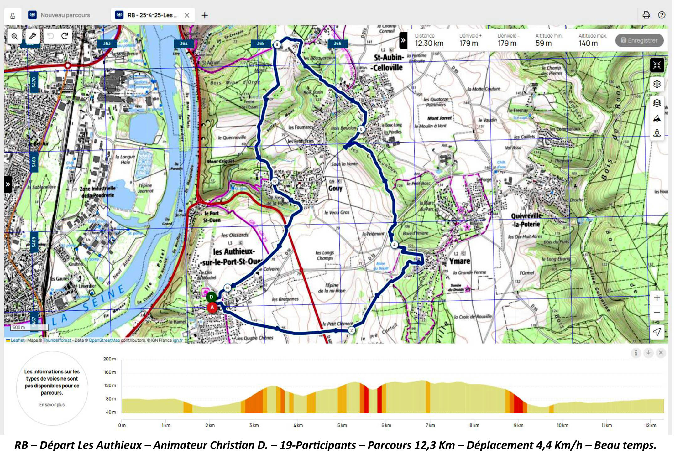 Lundi 28 Avril – Animateur Christian D., pour un départ à 14 Heures depuis le parking de la salle des fêtes – Les Authieux sur-le-Port-St Ouen – Circuit 12,3Km – 19 Participants – Déplacement 4,4Km/h – Beau temps. Bravo à Christian pour sa première randonnée pédestre, bonne organisation.