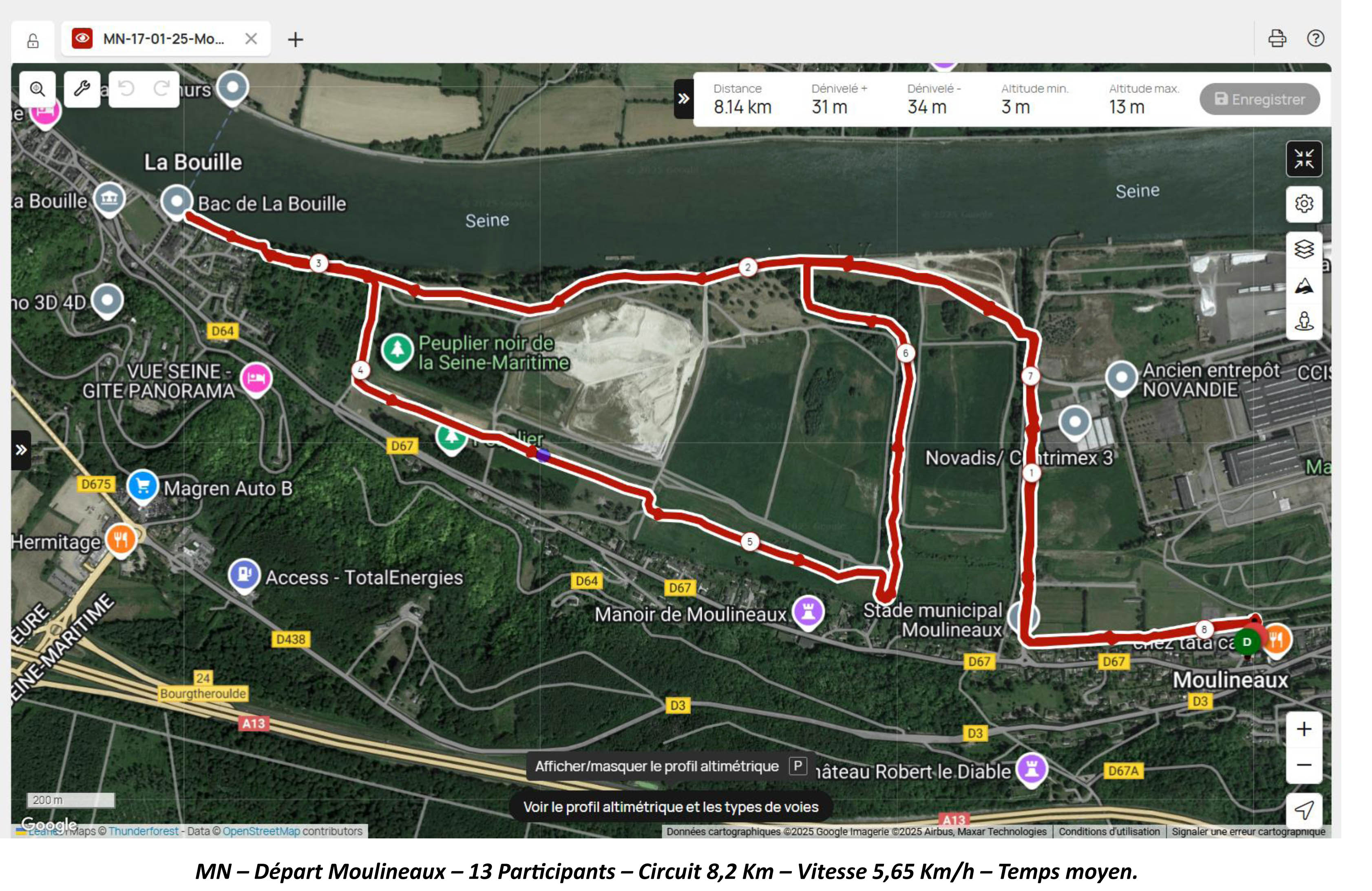 Marche Nordique –Vendredi 17 Janvier 25 – pour un départ à 8h50, depuis le parking de la Mairie de Moulineaux. Nos 2 Animateurs Alain & Patrick. 13 Participants – Circuit de 8,2 Km – Vitesse 5,65 Km/h -Temps moyen.