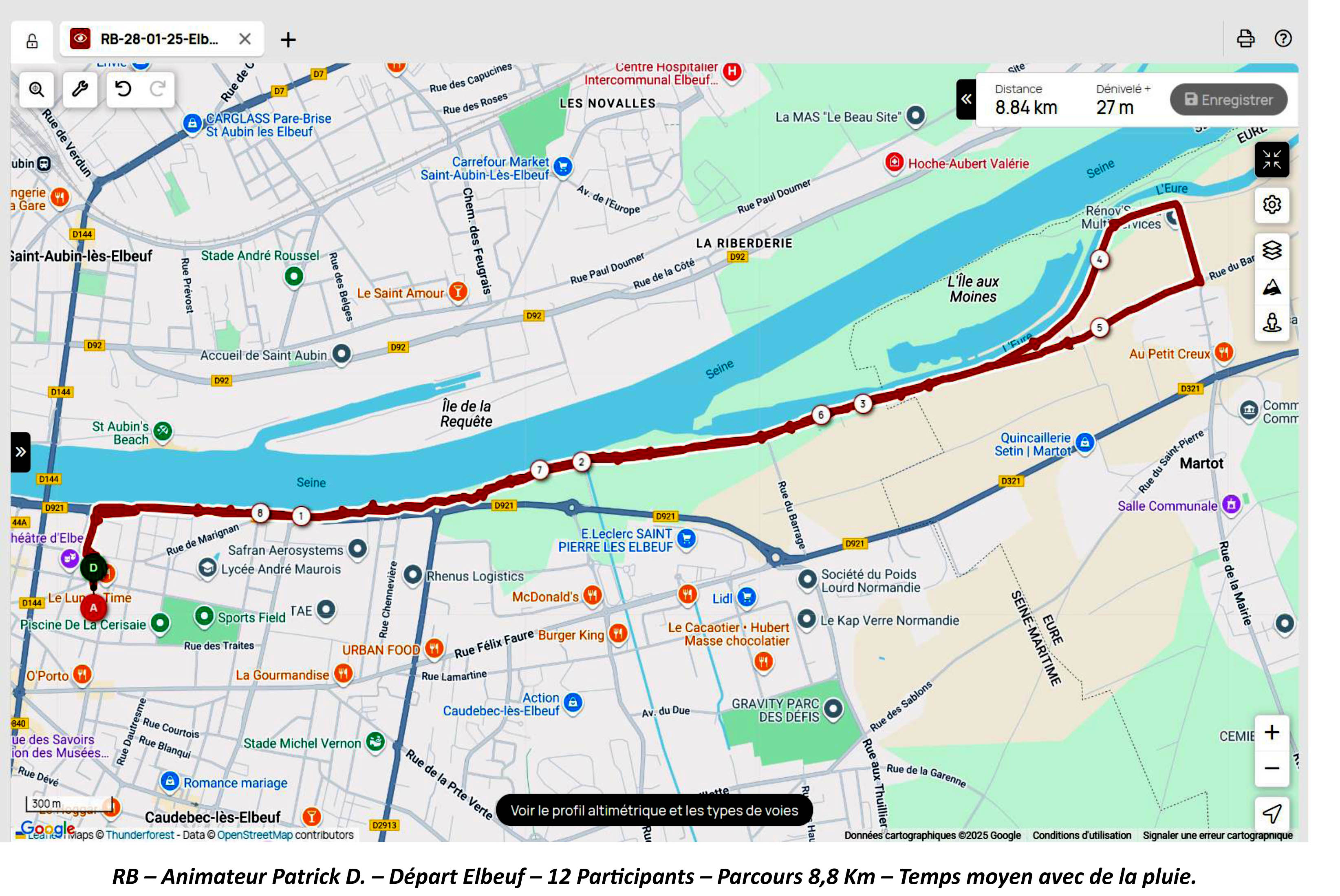 du Champ de Foire à Elbeuf. (les berges de la seine via Caudebec) 12 Participants – Parcours 8,8 Km sous la pluie.
