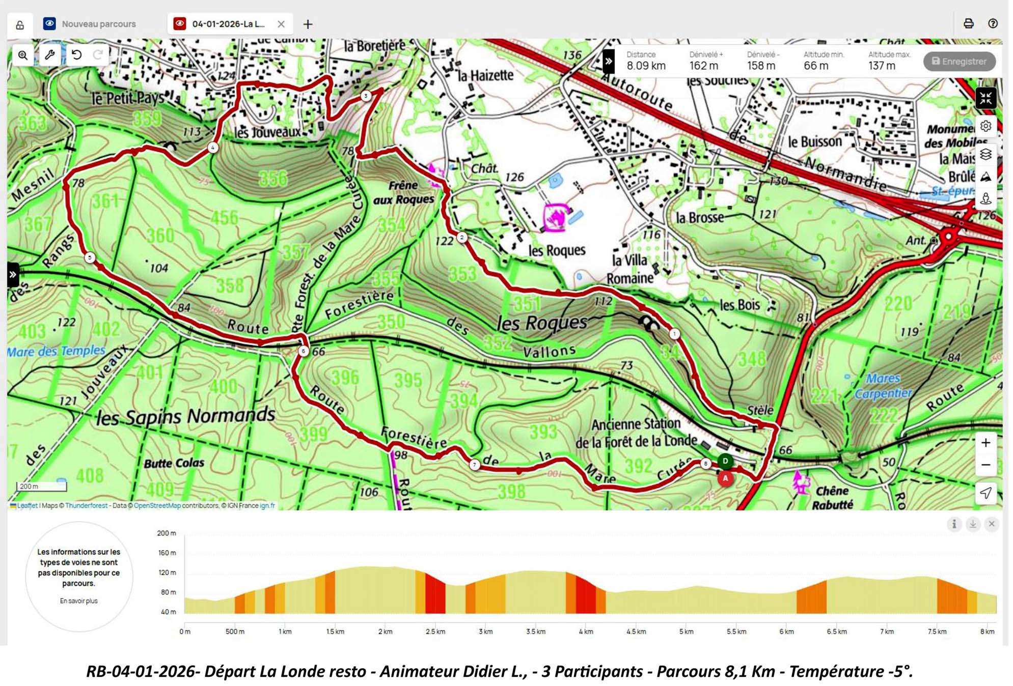 Dimanche 4 Janvier 2026, Animateur Didier L., pour un départ à 9 heures depuis le parking du resto > Rendez vous d’ Chasse – La Londe (Ancienne gare de la Londe 76500) > route D438 – Pour un circuit de 8,1 Km – 3 Participants – Température -5°, mais avec du soleil.