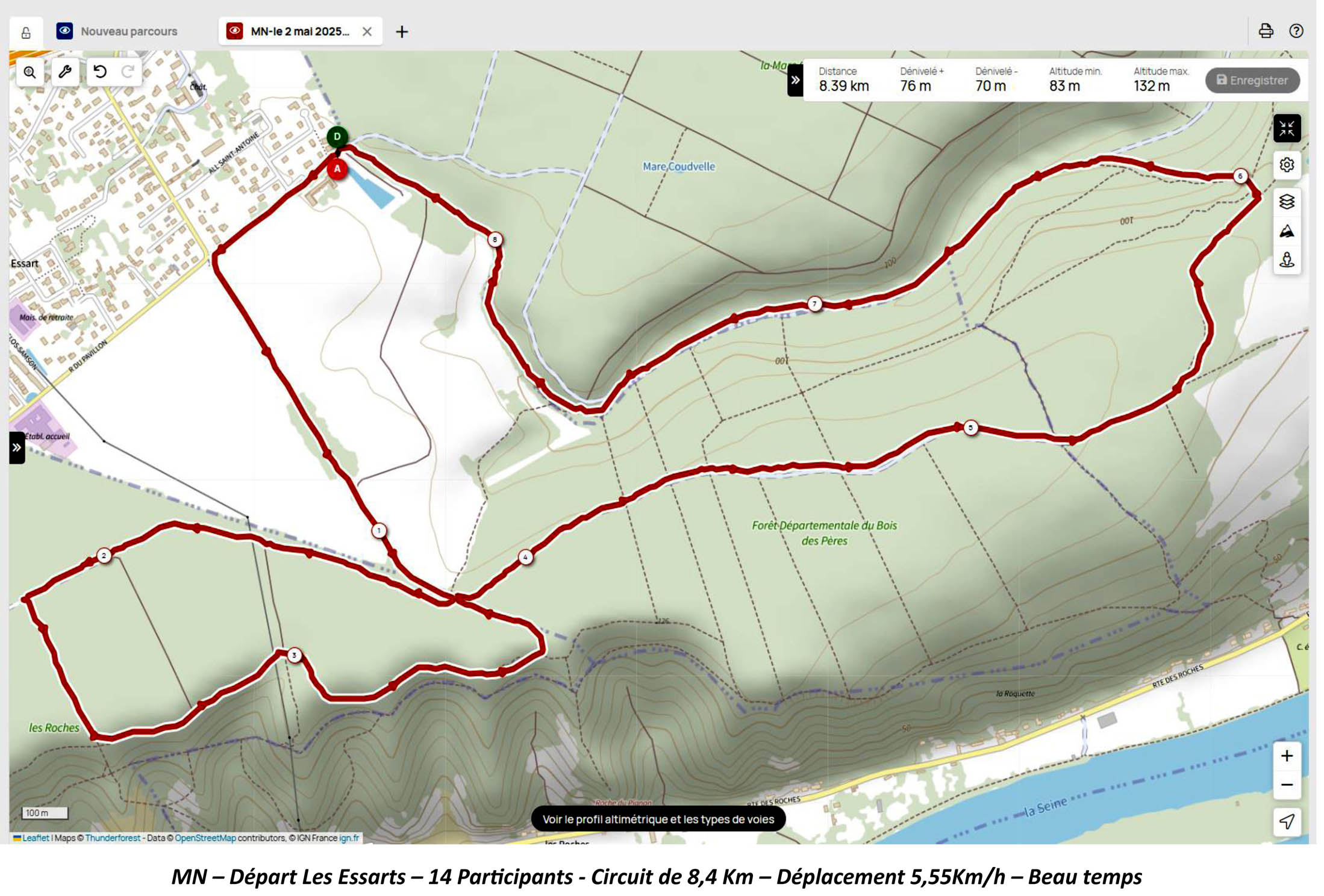 Marche Nordique –Vendredi 2 Mai – pour un départ à 8h50, depuis le Champ du Bois Les Essarts. Nos Animateurs. 14 Participants – Parcours 8n4 Km – Déplacement 5,6Km/h – Beau temps.
