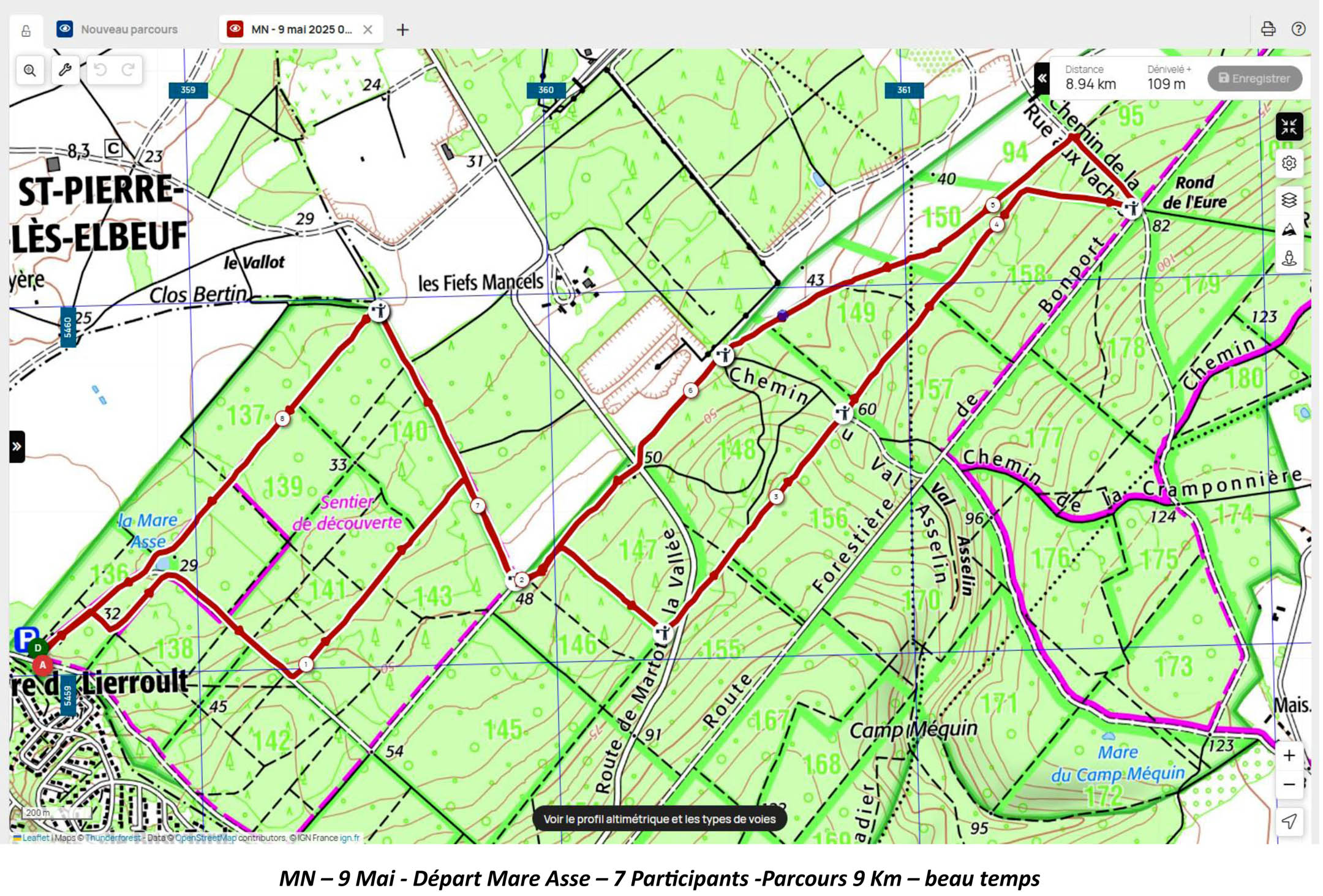 Marche Nordique –Vendredi 9 Mai– pour un départ à 8h50, depuis le parking – La Mare Asse – St Pierre les Elbeuf. Nos Animateurs – 7 Participants – Beau temps.