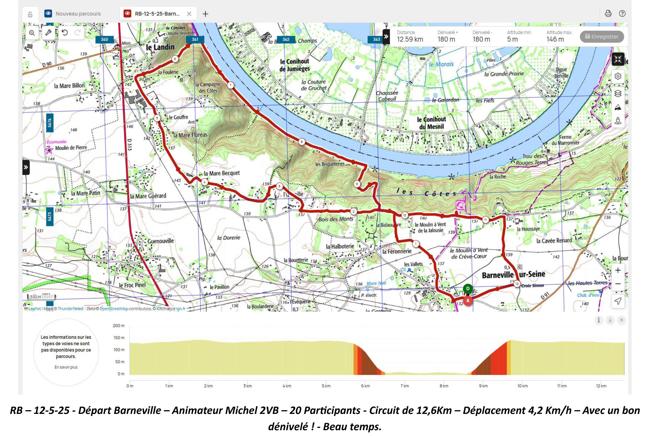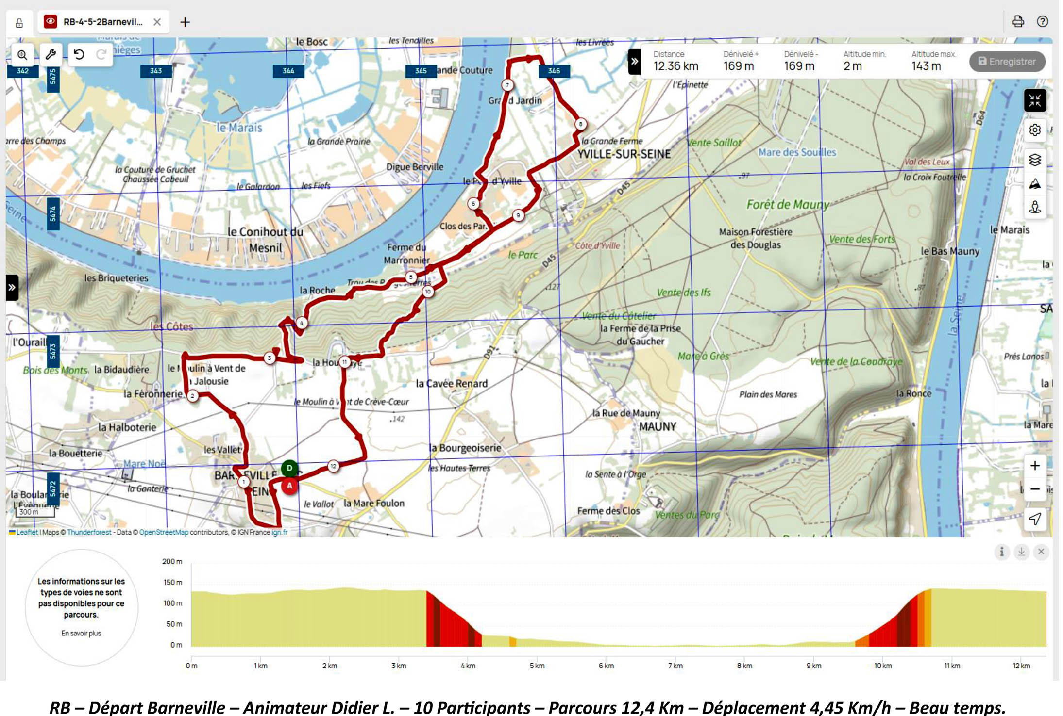 Dimanche 4 Mai – Animateur Didier L. pour un départ à 9 heures, depuis le parking de la Mairie de Barneville sur Seine – Circuit de 12,4 Km – 10 Participants – Dénivelé de 165 m. Déplacement 4,45 Km/h. – Beau temps.
