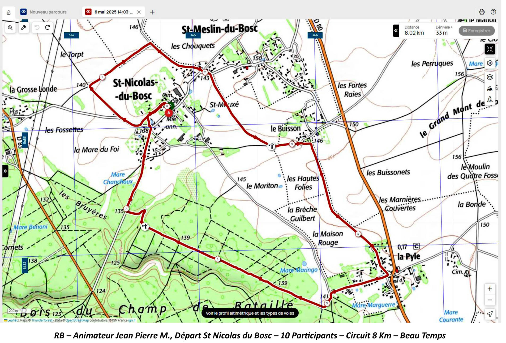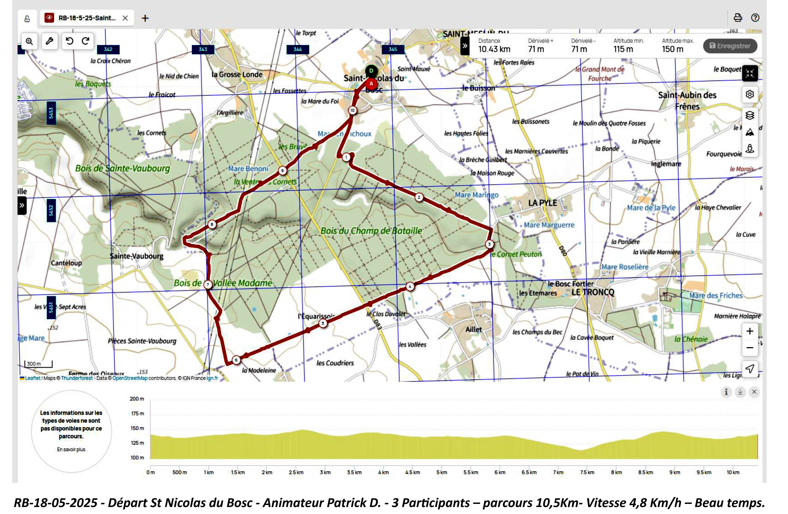 Dimanche 18 Mai, Animateur Patrick D., pour un départ à 9 heures, depuis le parking de l’église de St Nicolas du Bosc. Circuit de 10,5 Km. 3 Participants – Vitesse 4,8Km/h – Beau Temps.