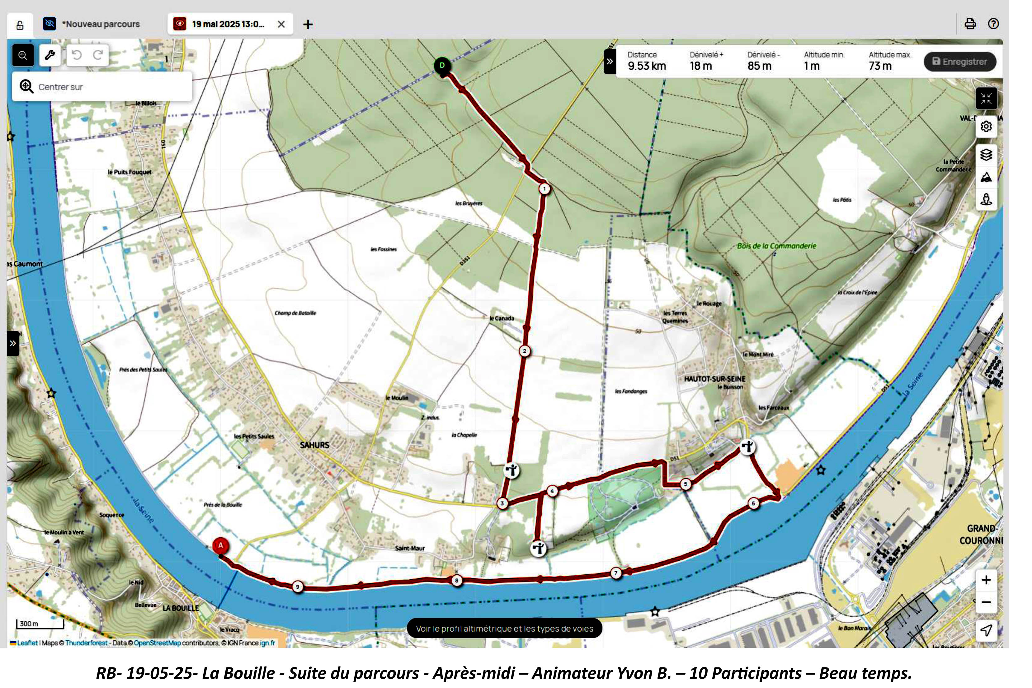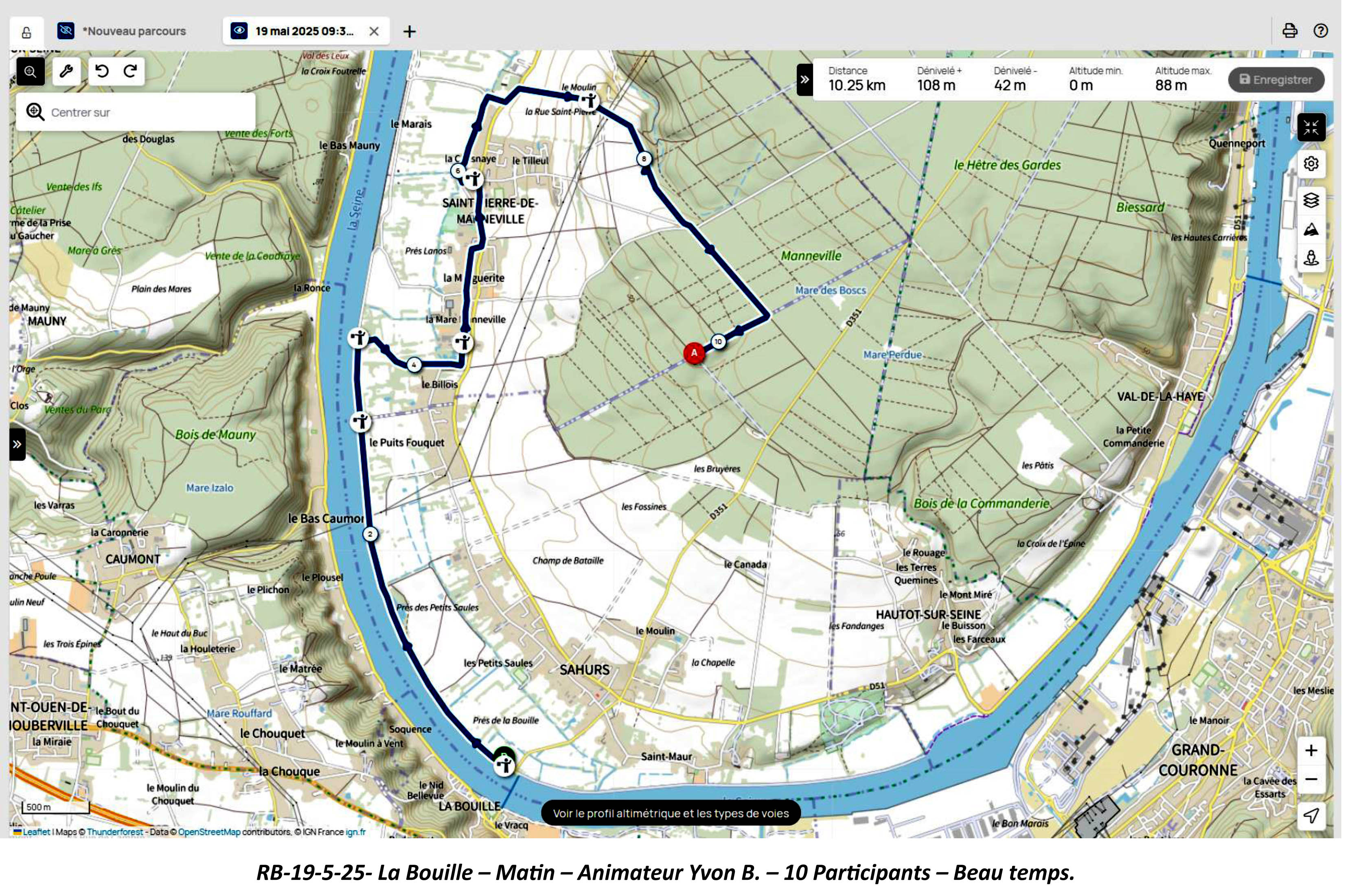 Lundi 19 MAI, Rando 1 jour, Animateur Yvon B. > Lieu de départ > place embarcadère du bac > La Bouille > départ à 9h20 pour prendre le bac : > La Bouille > Sahur. – Bravo, pour la première randonnée d’Yvon – 10 Participants – circuit de 20,1Km – Beau Temps.