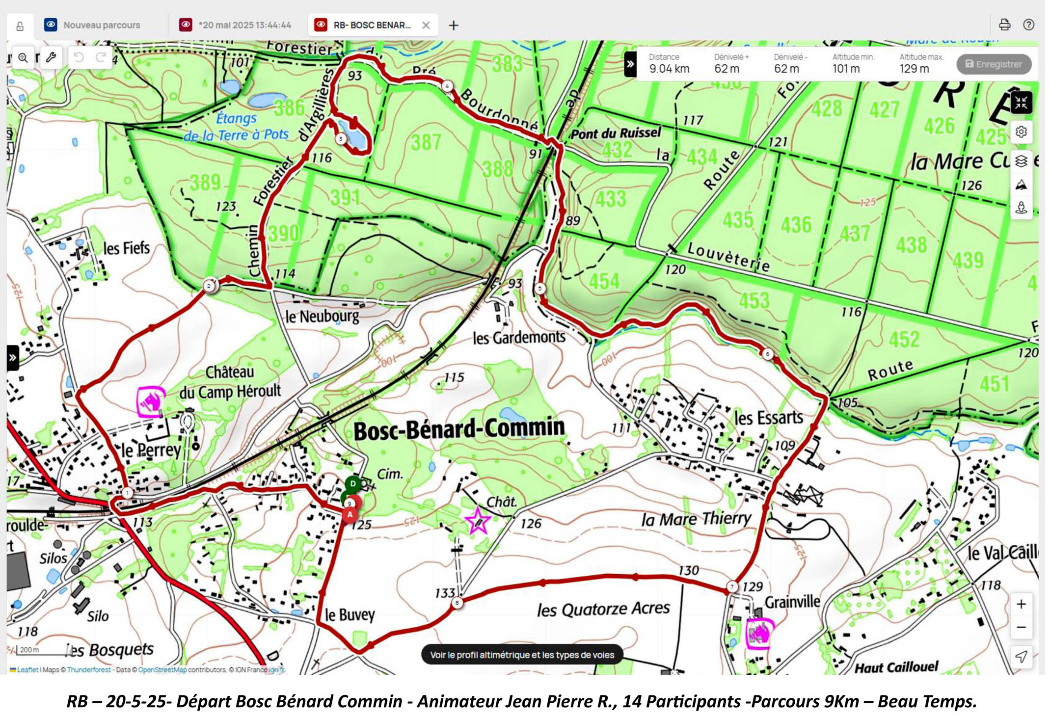 Mardi 20 Mai, Animateur Jean Pierre R., pour un départ à 14 Heures depuis le parking de l’église de Bosc Bénard Commin 27520. 14 Participants – circuit de 9 Km – Beau temps.