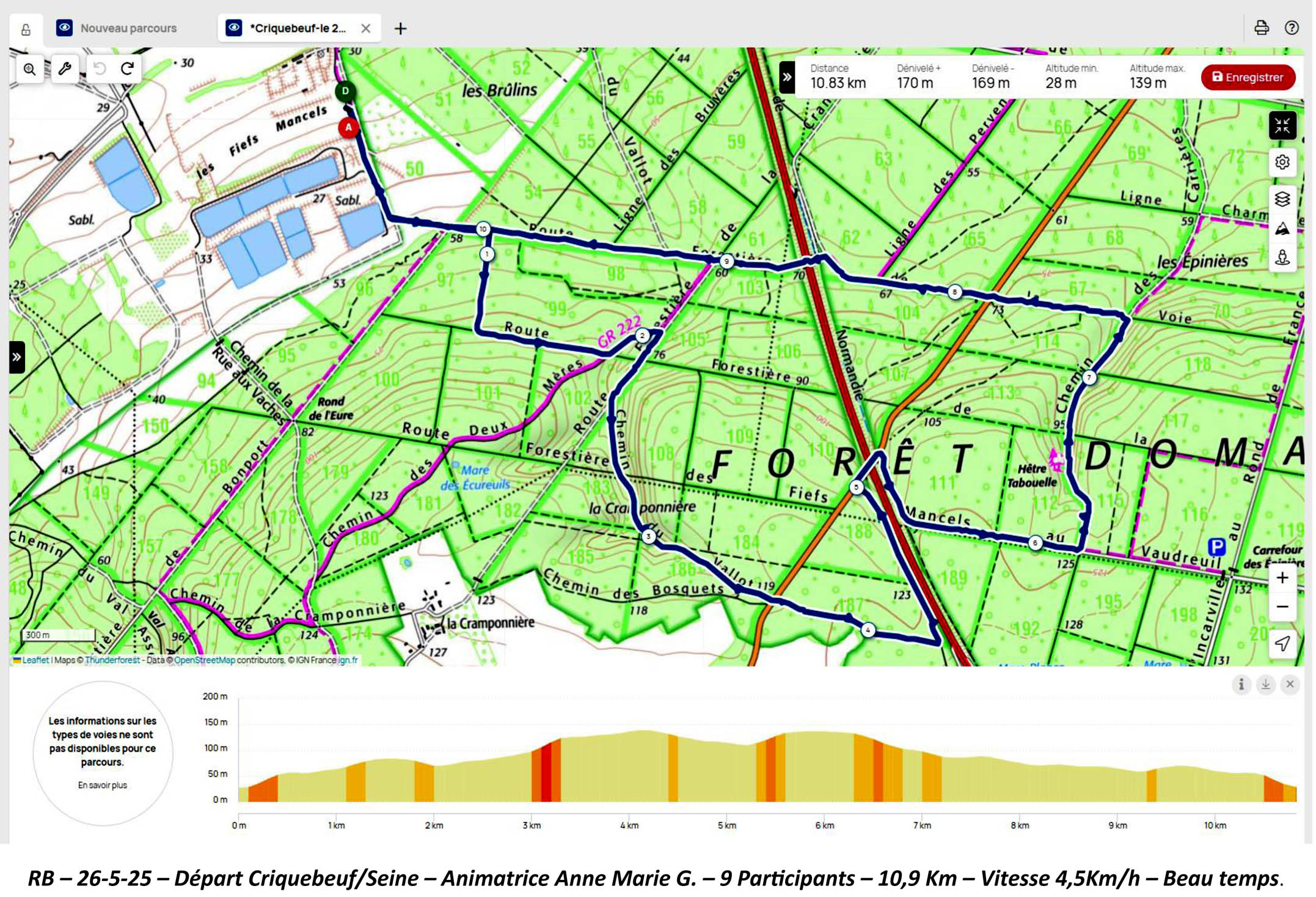 Lundi 26 Mai, Animatrice Anne Marie G., pour un départ à 14 Heures depuis le parking et point d’info rando situés au bout de l’allée de la forêt de Bord à Criquebeuf sur Seine. En arrivant à Criquebeuf en venant d’Elbeuf par la D321, tourner à droite Allée de la forêt de Bord (grand panneau indiquant Départ Randonnée) et dépasser très légèrement sur un chemin de terre le stand de ball trap.. Longueur de la rando : 11 km – 9 Participants – Vitesse 4,5 Km/h – Beau temps.