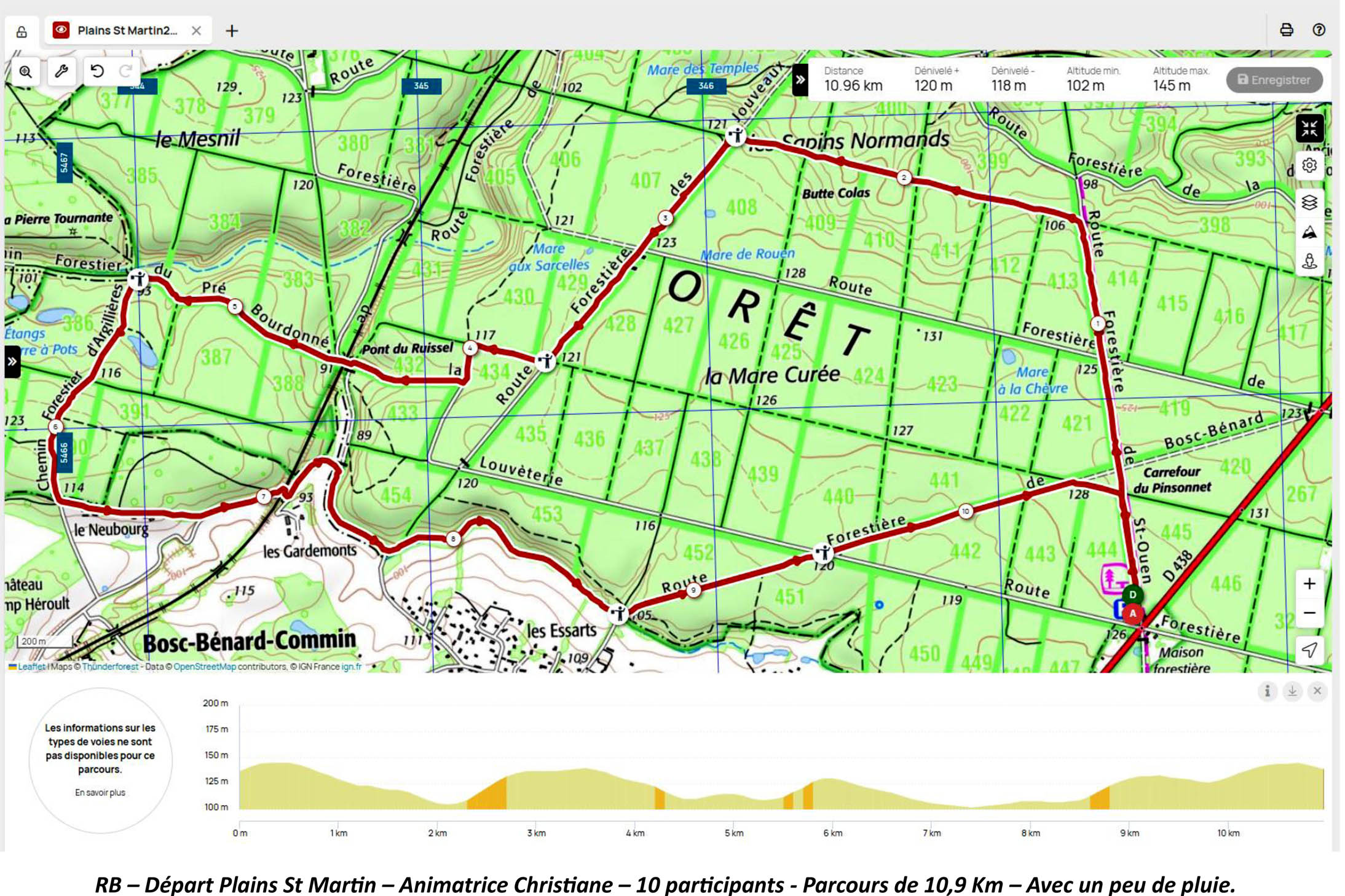 Lundi 20 Octobre, Animatrice Christiane P., pour un départ à 14 Heures depuis le parking Maison forestière des Plains St Martin par la D438 Route de Rouen > La Londe 76500. 10 Participants – Parcours 10,9Km – Avec un peu de pluie !