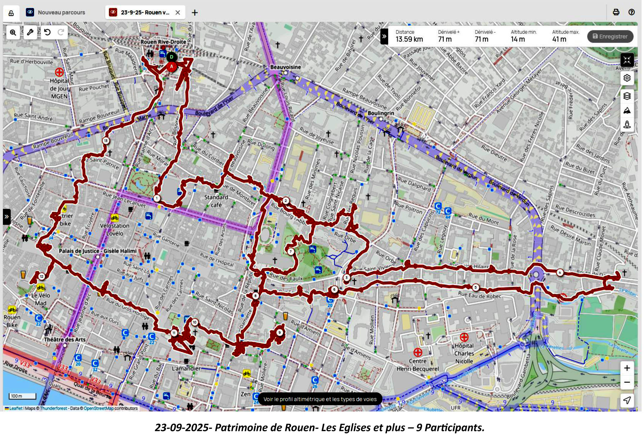 Le lieu du départ sera à la gare SNCF de Rouen pour 9h45 maxi, A la sortie de l’escalier du Métro Place B. Tissot. La visite sera un parcours des églises, mais pas que : Un exemple les maisons rue Eau de Robec, etc. – Il y a un certain nombre d’églises fermées pour travaux ou autre, mais l’architecture extérieure est de qualité, c’est bon pour les photographes randonneurs. Pas de bâtons de marche, prévoir un pique-nique du midi ou achat sur place d’un sandwich. La pause repas sera dans les environs du Jardin de l’Hôtel de ville/Abbatiale Saint Ouen. Pour le transport à vous de voir. Pour notre part nous serons au Parking du Centre Commercial LECLERC du Technopole à St Etienne du Rouvray, pour un départ par le Métro au plus tard 9 heures (les tickets peuvent être pris sur place (monnaie ou carte bancaire). A vous de faire votre choix pour le transport/déplacement. WC prévus au départ à la gare SNCF, & au jardin de St Ouen vers 12 h, en cas d’urgence, dans un bar (prévoir de pièces de 1 €) Le circuit sera dans les 13 km. Distance Bosroumois > 27 km > Rouen (temps de route 40 mn en voiture plus recherche d’un parking – Pour le métro départ du Madrillet Gare SNCF 30 mn). 9 Participants – Parcours de 13,6 Km – Temps frais le matin avec soleil après 13heures.