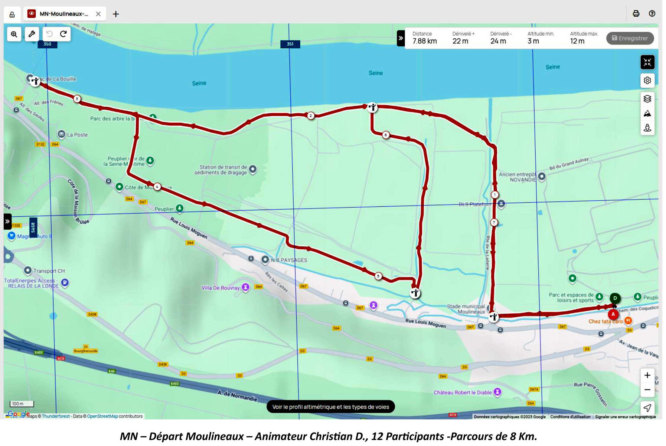Mardi 16 Septembre, Animateur Patrick D., pour un départ à 14 heures depuis le parking > de la Mairie de Moulineaux. Circuit de 7,5 km, 12 Participants – Beau temps.