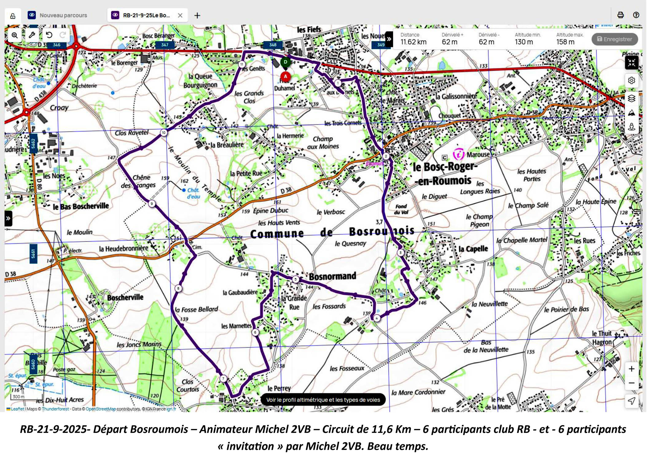 Dimanche 21 Septembre, Animateur Michel 2VB, pour un départ à 9 heures depuis le parking > Auchan à Bosroumois. Parcours 11,6 Km – 6 Participants RB et 6 participants invitation de Michel 2VB. Beau temps.