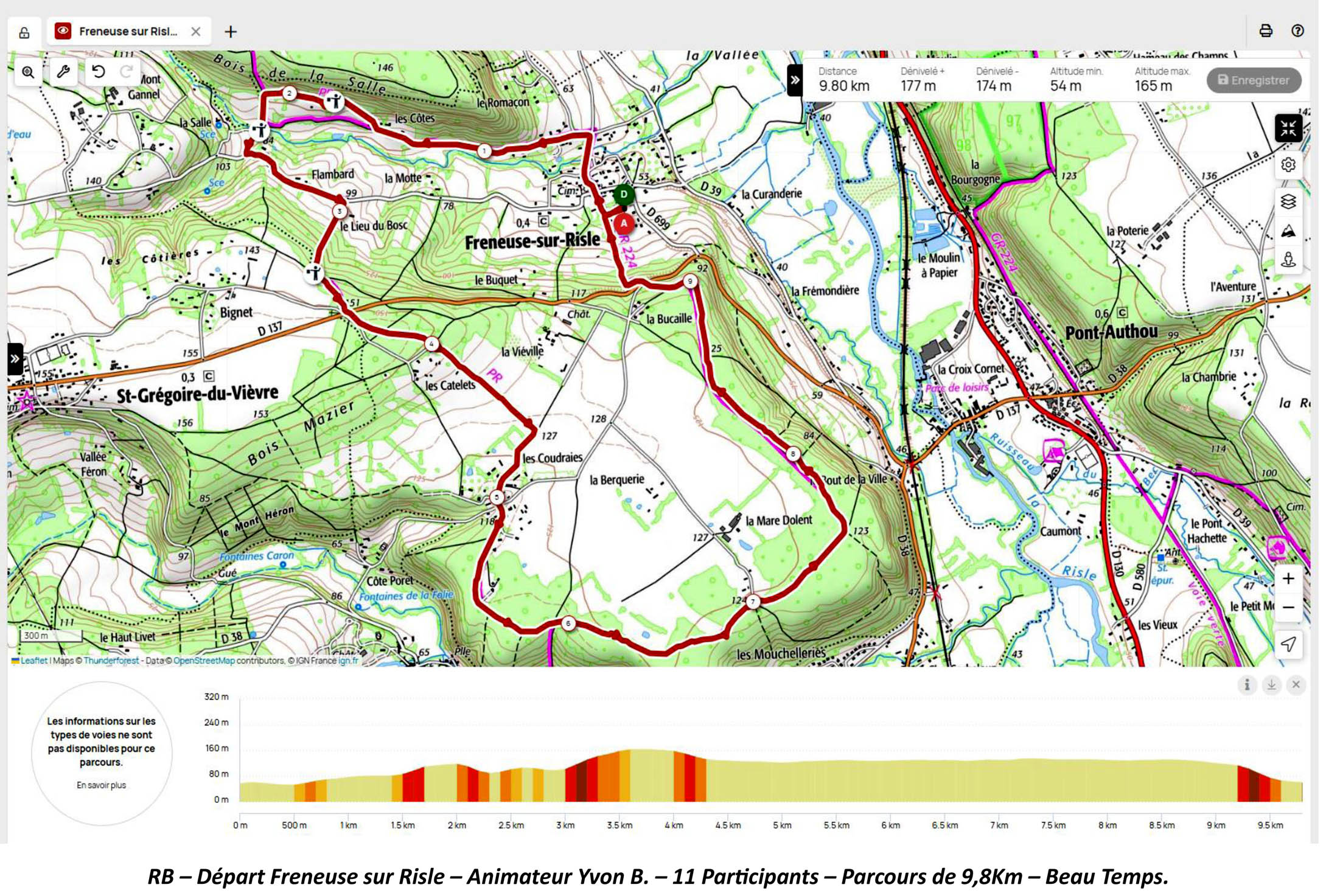 Lundi 22 Septembre, Animateur Yvon B. pour un départ à 14 heures depuis le parking mairie de Freneuse sur Risle. Parcours de 9,8 kms, 11 Participants – Beau temps.