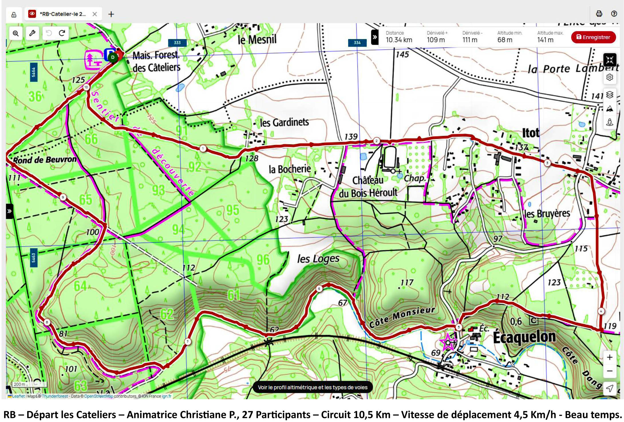 Lundi 29 septembre, Animatrice Christiane P. pour un départ à 14 Heures depuis le parking > Maison forestière des Cateliers dans la forêt d’ Illeville sur Montfort. Info venant de Christiane > Le rendez-vous est au parking des Cateliers ( ancienne maison forestière) Il faut prendre la D 88 puis au stop tourner à gauche sur la D 91 , puis à gauche dans la route forestière. 27 Participants – Circuit de 10,5Km – Vitesse 4,5 Km/h – Beau temps.